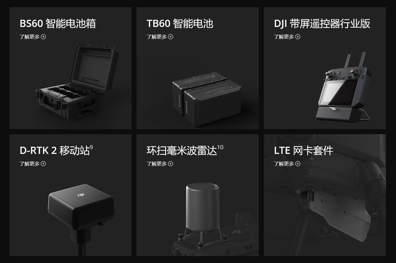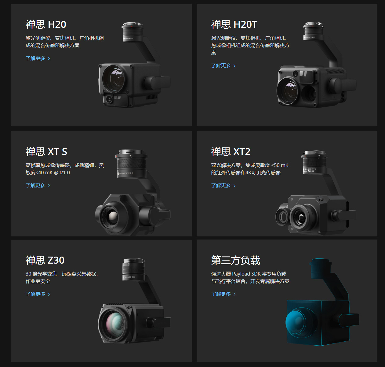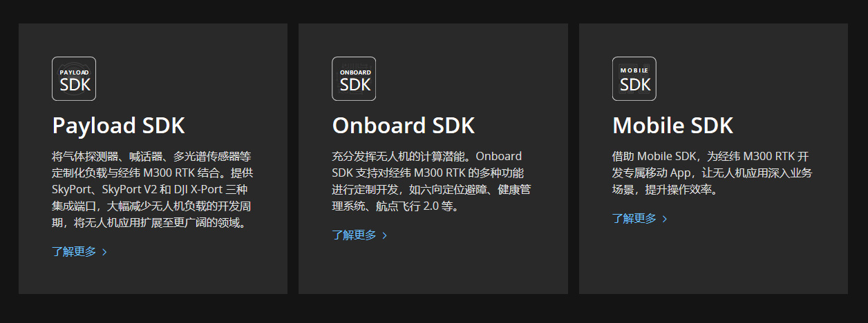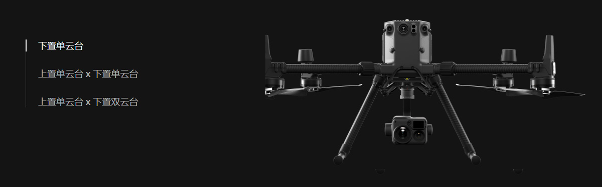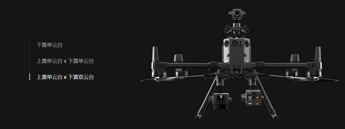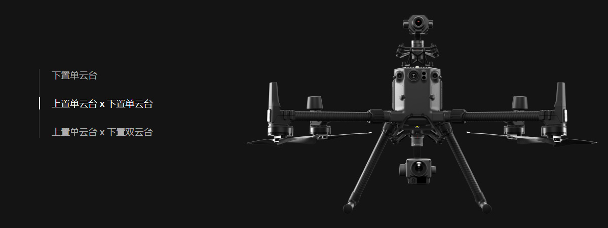 经纬 M300 RTK 提供下置双云台、上置单云台和 Onboard SDK 开放接口。最多可同时支持三个负载,最大载重达 2.7 公斤,让负载配置更加灵活。